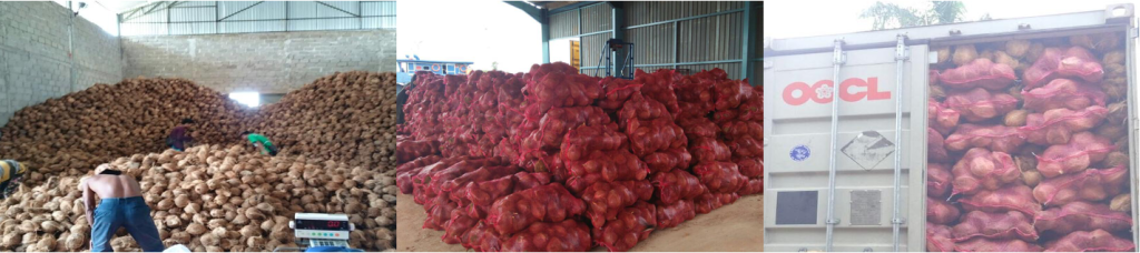 For large-scale distribution, coconuts are packed in durable net bags and shipped in refrigerated 40-foot containers.